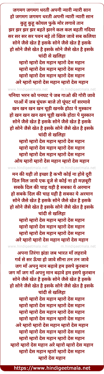 Lyrics of Mharo Desh Mahaan, Sone Jaise Khet Hain Iske - जगमग जगमग धरती अपनी न्यारी न्यारी सान