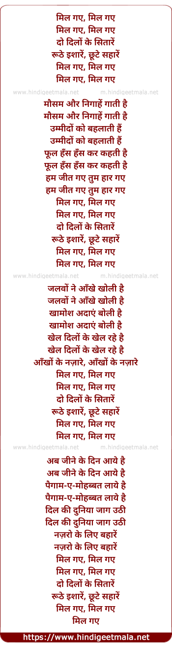 Lyrics of Mil Gaye Do Dilo Ke Sitare - मिल गए, मिल गए