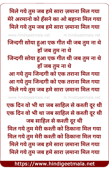 Lyrics of Mil Gaye Tum Jab - मिले गये तुम जब हमे सारा ज़माना मिल गया
