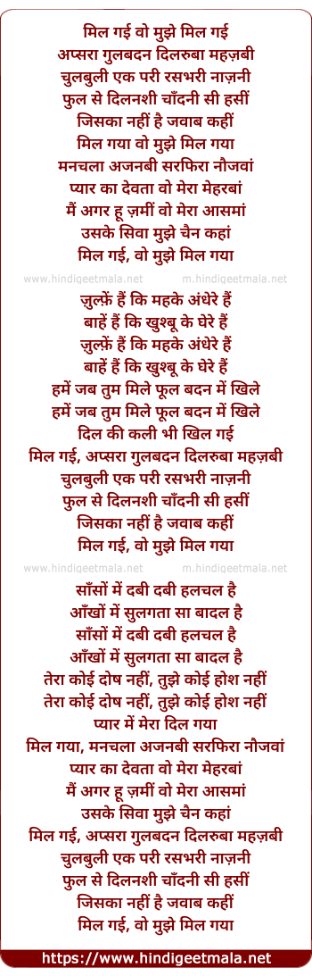 Lyrics of Mil Gayee Vo Mujhe Mil Gayee - मिल गई वो मुझे मिल गई