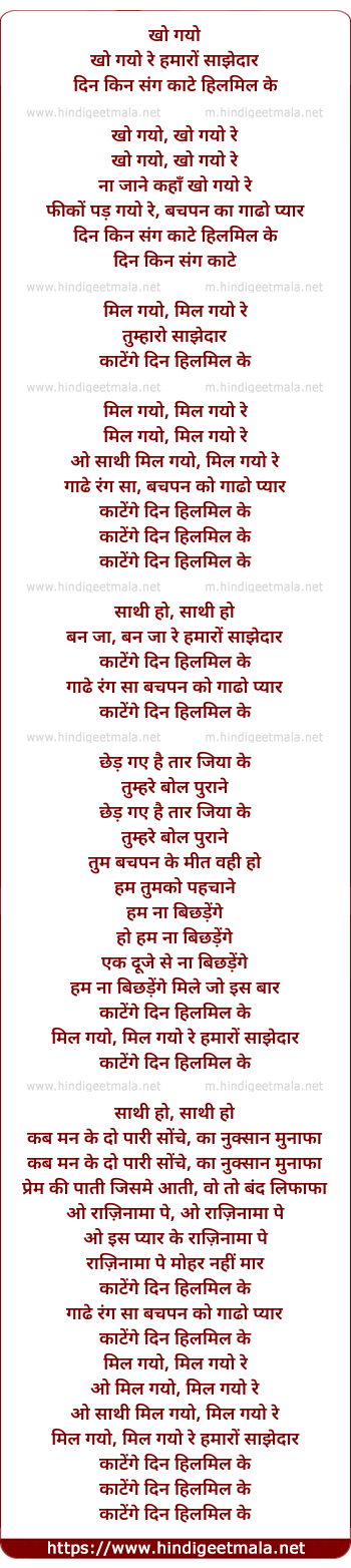 Lyrics of Mil Gayo Mil Gayo Re - मिल गयो मिल गयो रे