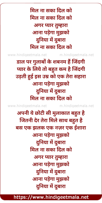Lyrics of Mil Naa Sakaa Dil Ko Agar Pyaar Tumhaaraa Mukesh Gazal - मिल ना सका दिल को