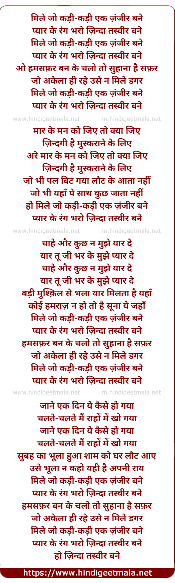 Lyrics of Mile Jo Kadi Kadi Ek Zanjir Bane - मिले जो कड़ी-कड़ी एक ज़ंजीर बने