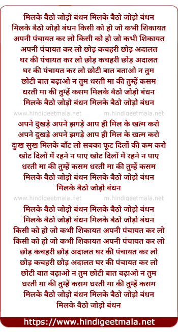 Lyrics of Milke Baitho Jodo Bandhan, Kisi Ko Ho Jo Kabhi Shikayat - मिलके बैठो जोड़ो बंधन ,किसी को हो जो कभी शिकायत