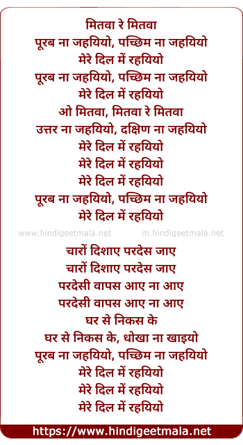 Lyrics of Mitwa Re Mitwa Purab Na Jaiyo - मितवा रे मितवा पूरब ना जइयो
