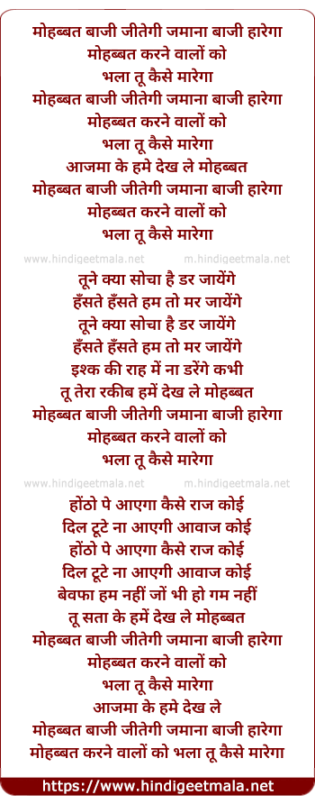 Lyrics of Mohabaat Baazi Jitegi Jamana Baazi Harega - मोहब्बत बाजी जीतेगी जमाना बाजी हारेगा