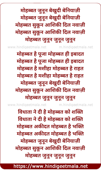 Lyrics of Mohabbat Junoon Bekhudi Beniyazi - मोहब्बत जुनून बेखुदी बेनियाज़ी