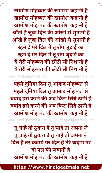 Lyrics of Mohabbat Ki Khamosh Kahani Hai - खामोश मोहब्बत की खामोश कहानी है