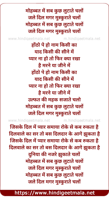 Lyrics of Mohabbat Me Sab Kuch Lutate Chalo - मोहब्बत में सब कुछ लुटाते चलो