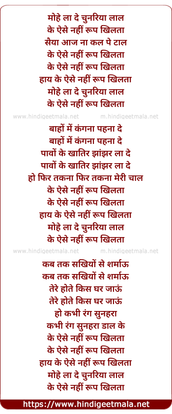 Lyrics of Mohe Laa De Chunariya Lal Ke Hai - मोहे ला दे चुनरिया लाल के है