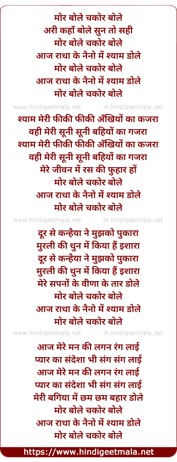 Lyrics of Mor Bole Chakor Bole Aaj Radha Ke Naino Me Shyam Dole - मोर बोले चकोर बोले आज राधा के नैनों में श्याम डोले