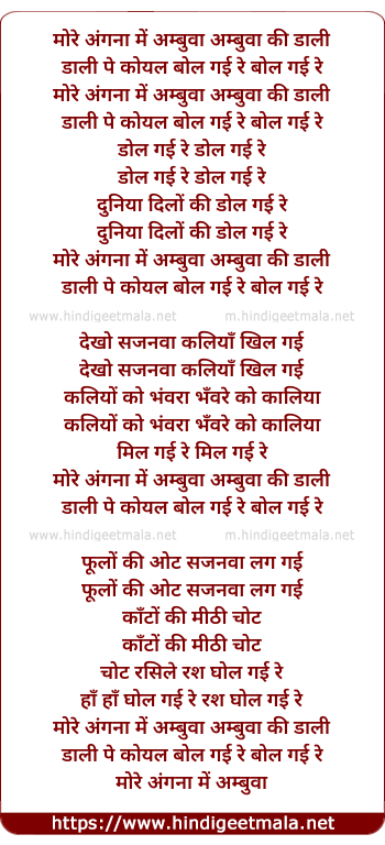 Lyrics of More Angana Me Ambuva Ki - मोरे अंगना में अम्बुवा अम्बुवा की डाली