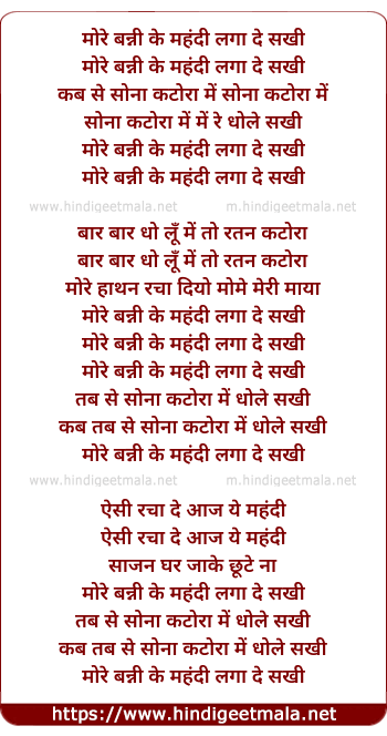 Lyrics of More Banni Ke Mehendi Laga De Sakhi - मोरे बन्नी के महंदी लगा दे सखी
