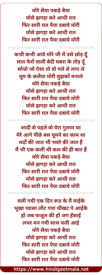 Lyrics of More Saiya Pakde Baiyan, Mose Jhagda Kare - मोरे सैया पकड़े बैया,मोसे झगड़ा करे