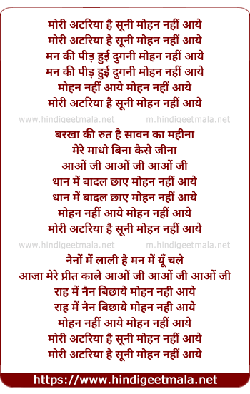 Lyrics of Mori Atariya Hai Suni Mohan Nahi Aaye - मोरी अटरिया है सूनी मोहन नहीं आये