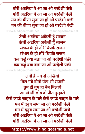 mori atariya pe aa ja o pardeshi panchhi