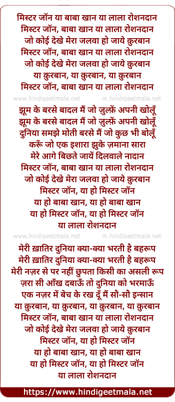 Lyrics of Mr John Yaa Baabaa Khaan, Jo Koi Dekhe Meraa Jalawaa - मिस्टर जॉन या बाबा खान, जो कोई देखे मेरा जलवा