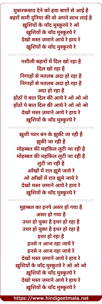 Lyrics of Mubaarakabaad Dene Ko, Khushiyon Ke Chaand Muskuraye Re - मुबारकबाद देने को खुशियों के चाँद मुस्कुराये रे