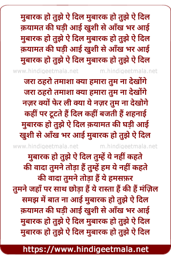 Lyrics of Mubarak Ho Tujhe Aye Dil - मुबारक हो तुझे ऐ दिल