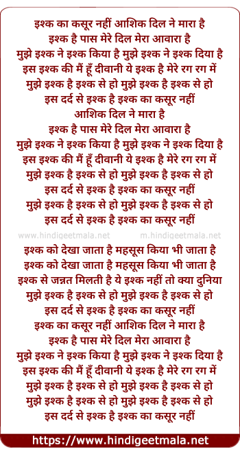 Lyrics of Mujhe Ishq Hai Ishq Se (Ishq Se Ishq) - इश्क का कसूर नहीं आशिक दिल ने मारा है