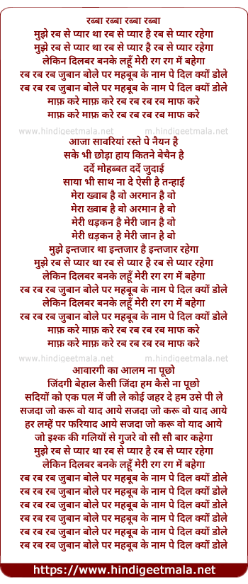 Lyrics of Mujhe Raba Se Pyar Tha - रब्बा रब्बा रब्बा रब्बा