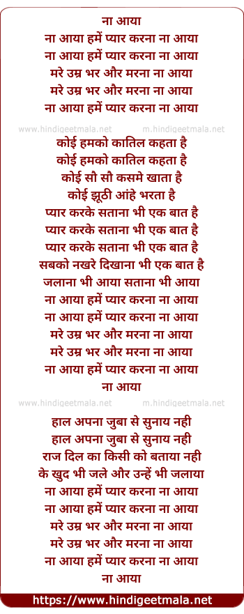 Lyrics of Na Aaya Hume Pyar Karna - ना आया हमें प्यार करना