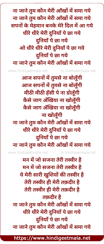 Lyrics of Na Jane Tum Kaun Meri Ankhon Me Sama Gaye - ना जाने तुम कौन मेरी आँखों में समा गये