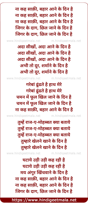 Lyrics of Na Kah Saaqi Bahar Aane Ke Din Hai - ना कह साक़ी, बहार आने के दिन है