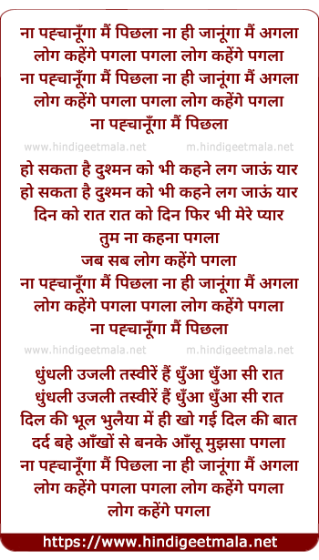 Lyrics of Na Mai Jaanu Pichhala Na Mai Jaanu Agala Log Kahege Pagla Pagla - ना मैं जानू पिछला ना मैं जानु अगला लोग कहेंगे पगला पगला