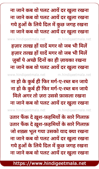 Lyrics of Naa Jaane Kab Woh Palat Aaye - ना जाने कब वो पलट आयें दर खुला रखना