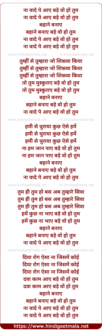 Lyrics of Naa Wade Pe Aaye Bade Wo Ho - ना वादे पे आए बड़े वो हो तुम