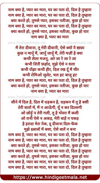 Lyrics of Naam Kya Hai, Pyar Ka Mara - नाम क्या है, प्यार का मारा
