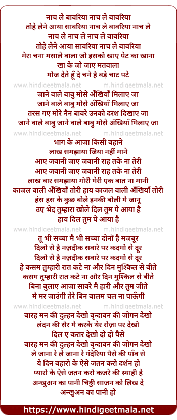 Lyrics of Nach Le Bawariyaa Tohe Lene Aaya Sawariya - नाच ले बावरिया तोहे लेने आया सावरिया