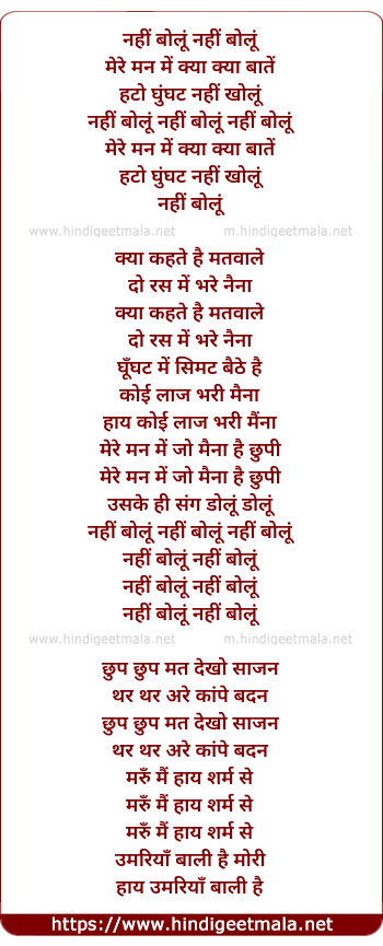 Lyrics of Nahi Bolu, Ghunghat Nahi Kholu - नहीं बोलूं, घुंघट नहीं खोलूं