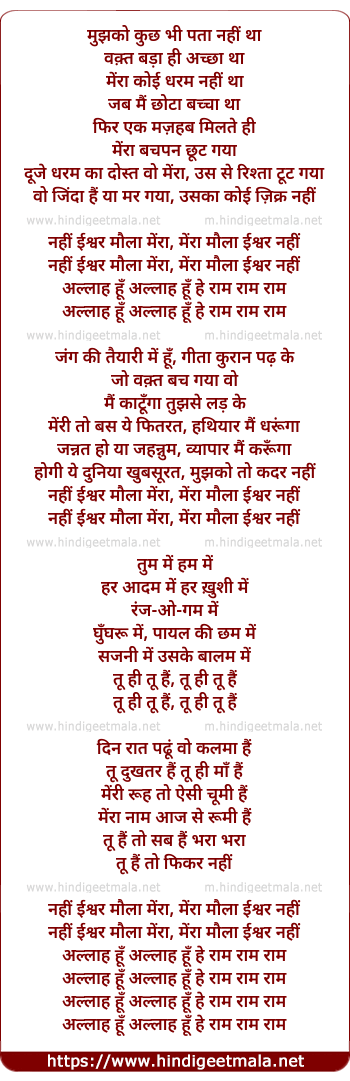 Lyrics of Nahi Ishwar Maula Mera - नहीं ईश्वर मौला मेरा