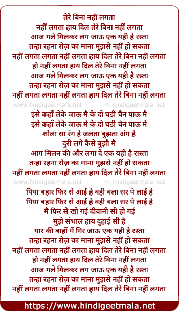 Lyrics of Nahin Lagta Haye Dil Tere Bina, Nahi Lagta - नहीं लगता हाय दिल तेरे बिना, नहीं लगता