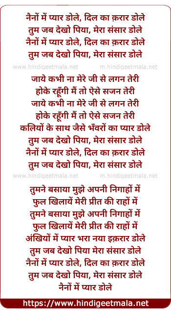 Lyrics of Naino Me Pyar Dole, Dil Ka Qaraar Dole - नैनों में प्यार डोले, दिल का क़रार डोले