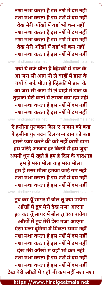 Lyrics of Nasha Nasha Karta Hai - नशा नशा करता है