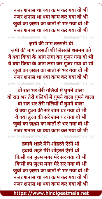 Lyrics of Nazar Shanaas Tha - नजर शनास था क्या काम कर गया वो भी