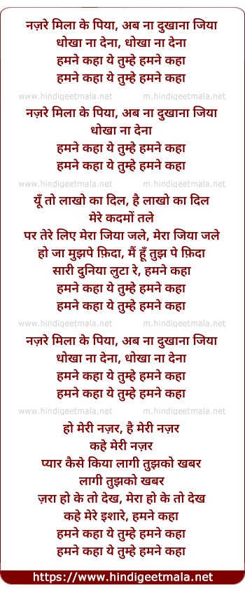 Lyrics of Nazare Mila Ke Piya Ab Na Dukhana Jiya - नज़रे मिला के पिया, अब ना दुखाना जिया