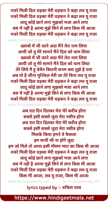 Lyrics of Nazre Mili Dil Dhadka, Meri Dhadkan Ne Kaha Love You Raja - नजरें मिली दिल धड़का, मेरी धड़कन ने कहा लव यू राजा