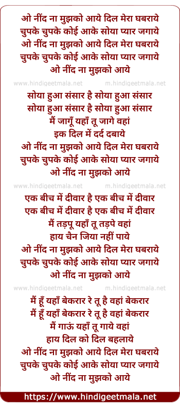 Lyrics of Neend Naa Mujhko Aaye - नींद ना मुझको आये