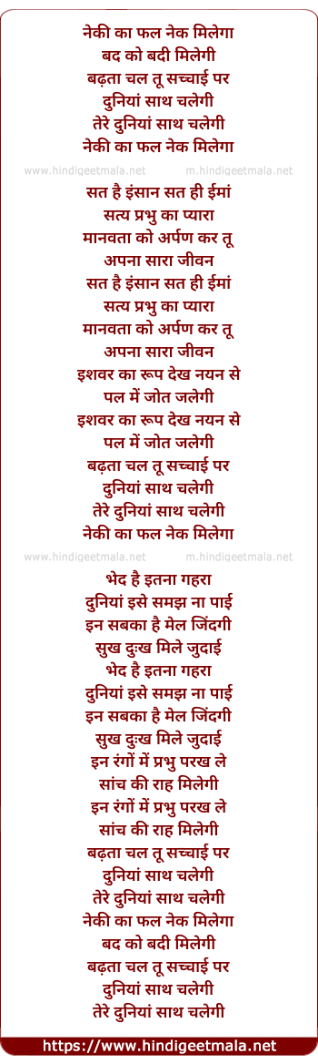 Lyrics of Neki Ka Fal Nek Milega - नेकी का फल नेक मिलेगा