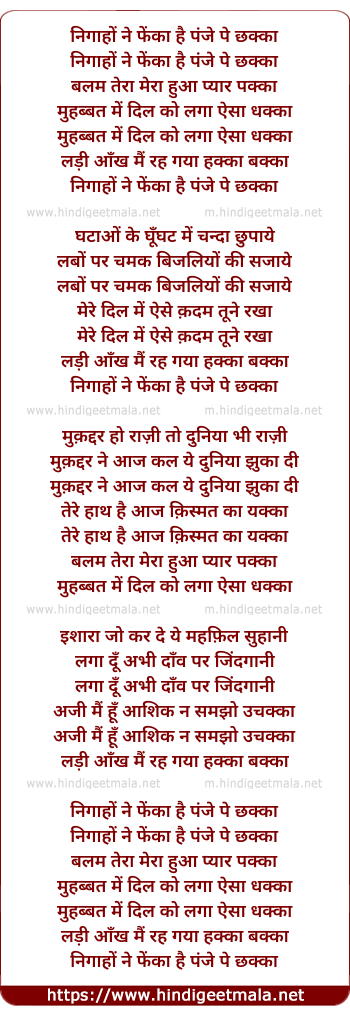Lyrics of Nigaahon Ne Phenkaa Hai Panje Pe Chhakkaa - निगाहों ने फेंका है पंजे पे छक्का