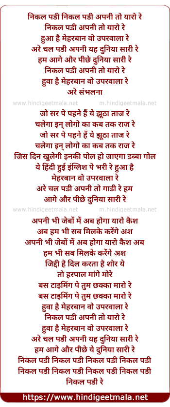 Lyrics of Nikal Padee Apanee Toh Yaaro Re - निकल पडी निकल पडी अपनी तो यारो रे