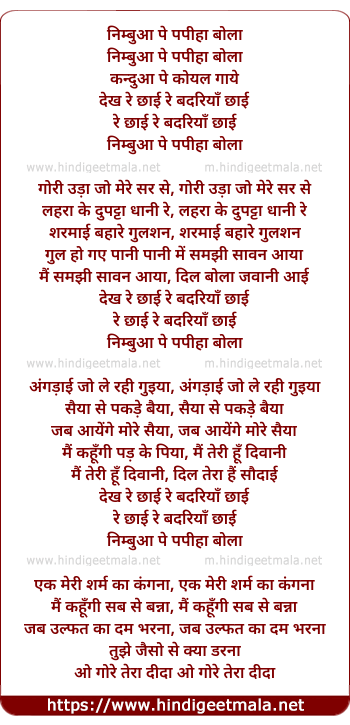Lyrics of Nimbua Pe Papiha Bolaa Kandua Pe Koyal Gaye - निम्बुआ पे पपीहा बोला कन्दुआ पे कोयल गाये