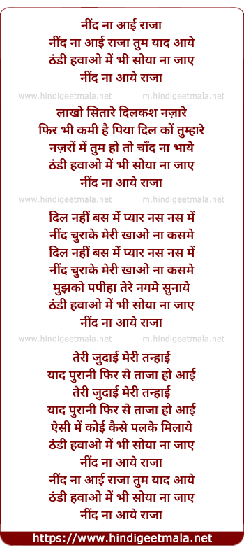 Lyrics of Nind Na Aayi Raja Tum Yaad Aaye - नींद ना आई राजा तुम याद आये