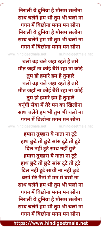 Lyrics of Nirali Ye Duniya Hai Mausam Salona - निराली ये दुनिया है मौसम सलोना