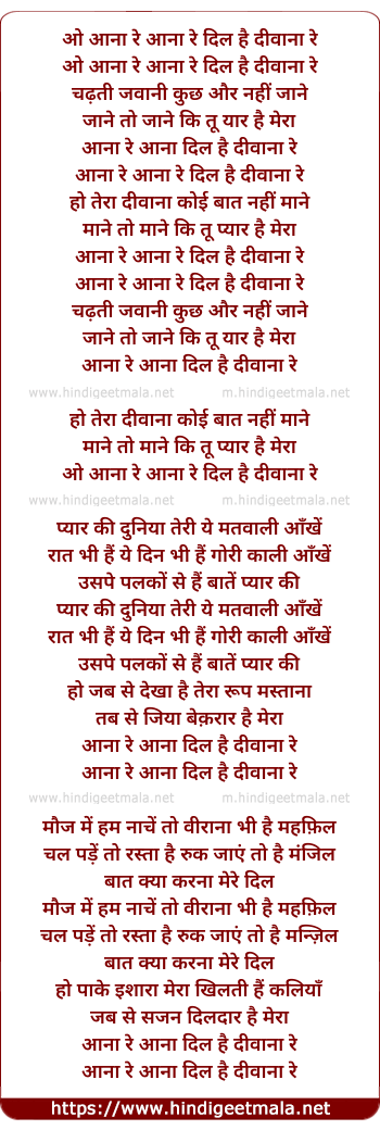 Lyrics of O Aana Re Aana Re, Dil Hai Divana Re - ओ आना रे आना रे दिल है दीवाना रे