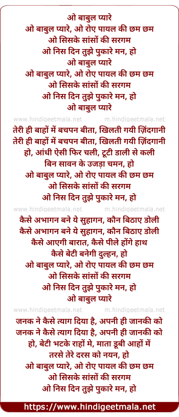 Lyrics of O Baabul Pyaare O Roe Paayal Ki Chham Chham - ओ बाबुल प्यारे, ओ रोए पायल की छम छम